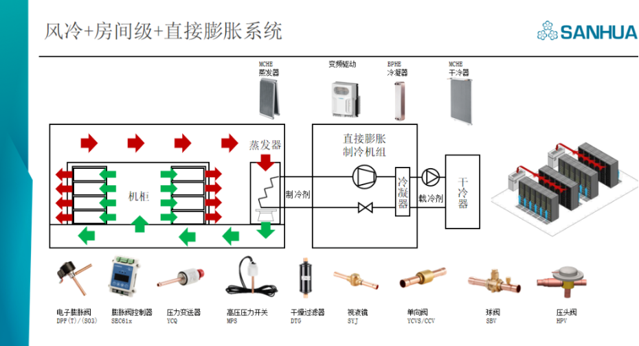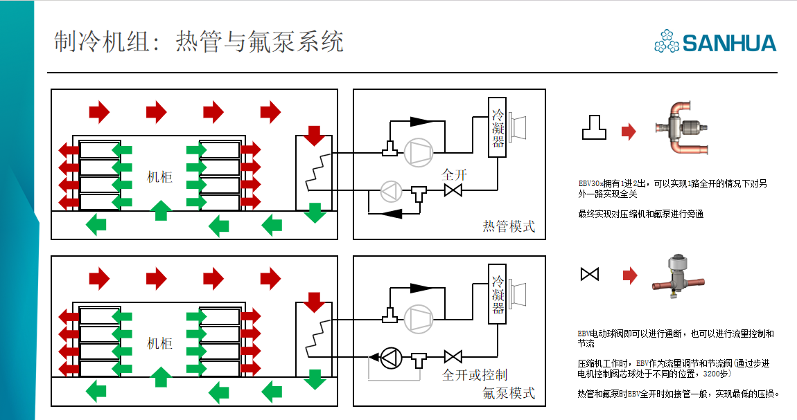 In terms of cold source, magnetic suspension centrifuge is widely used in large data centers, and Sanhua has introduced a series of oil-free self-lubricating components to ensure the reliable operation of the system. VPF electronic expansion valve and EBV electric ball valve (dual-purpose valve for load balancing/hot gas bypass) have been highly appreciated by many cold source equipment manufacturers.